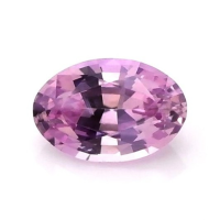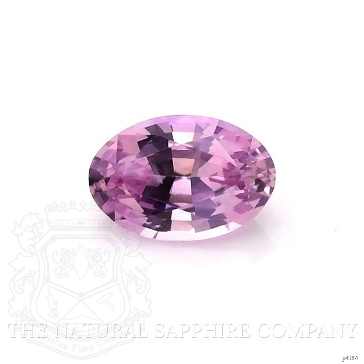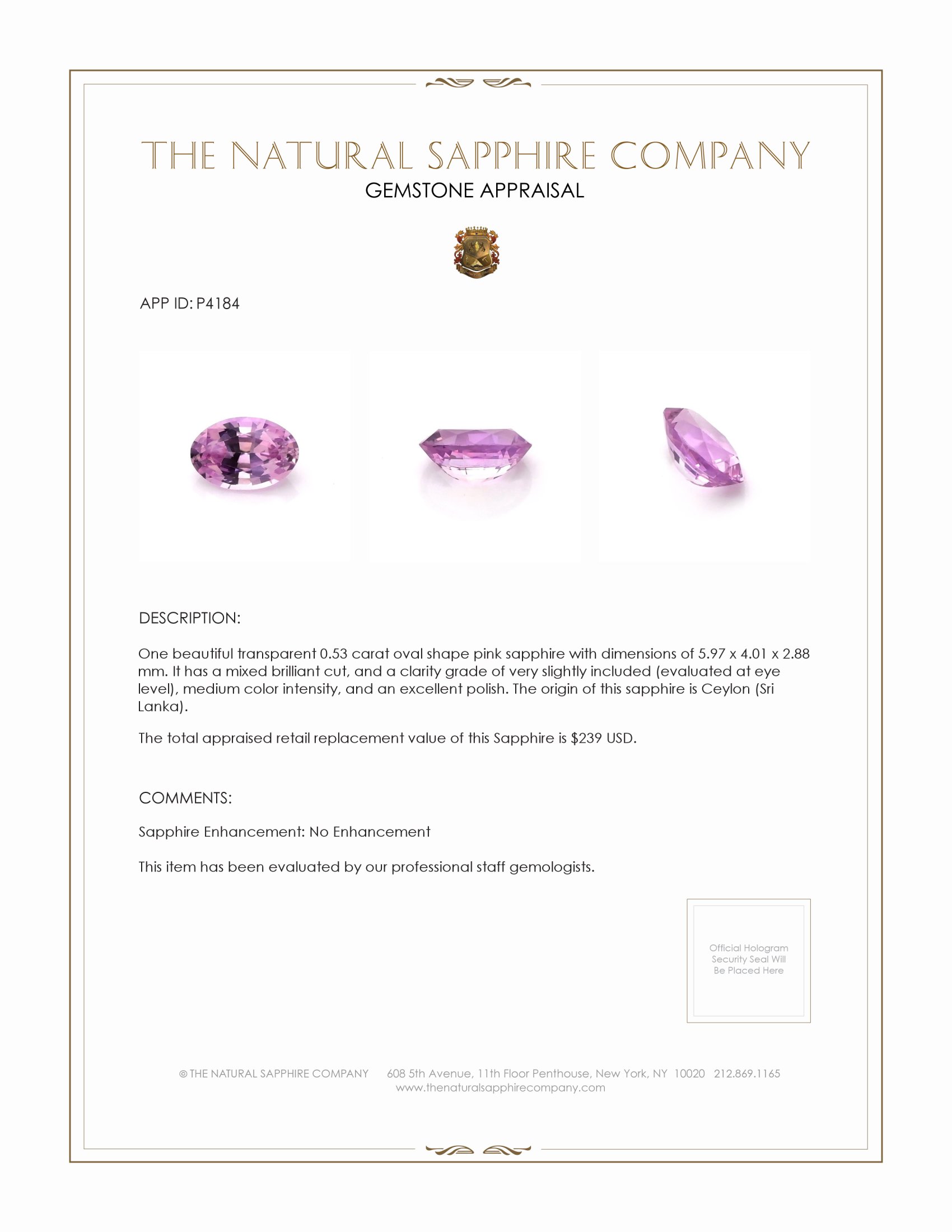 The ring features a beautiful, transparent 0.53 carat oval shape pink sapphire with the dimensions of 5.97 x 4.01 x 2.88 mm and a mixed brilliant cut. It has a clarity grade of very slightly included (evaluated at eye level), medium color saturation, and an excellent polish. The origin of this sapphire is Ceylon (Sri Lanka).
