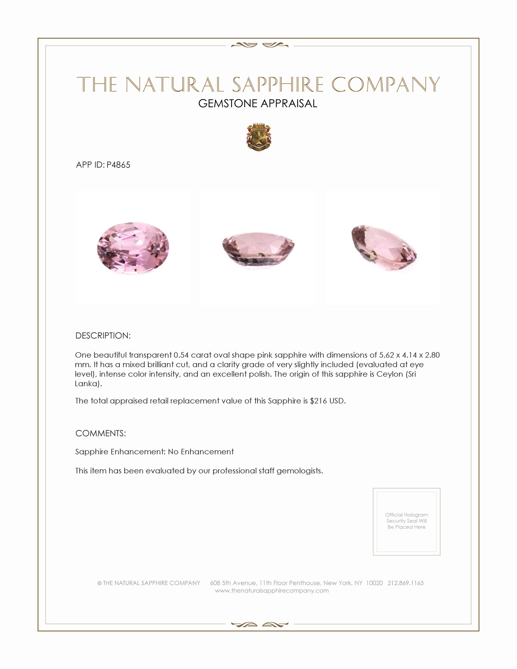 The ring features a beautiful, transparent 0.54 carat oval shape pink sapphire with the dimensions of 5.62 x 4.14 x 2.80 mm and a mixed brilliant cut. It has a clarity grade of very slightly included (evaluated at eye level), intense color saturation, and an excellent polish. The origin of this sapphire is Ceylon (Sri Lanka).