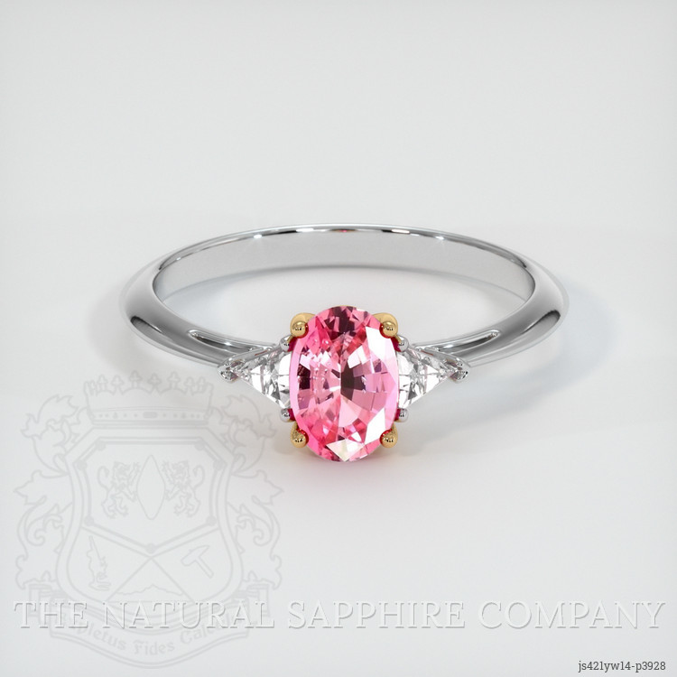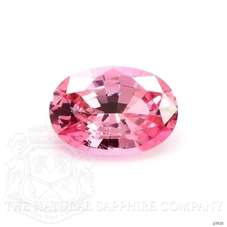 The ring features a beautiful, transparent 0.67 carat oval shape pink sapphire with the dimensions of 6.66 x 4.64 x 2.92 mm and a mixed brilliant cut. It has a clarity grade of very slightly included (evaluated at eye level), medium color saturation, and an excellent polish. The origin of this sapphire is Ceylon.