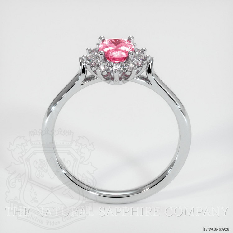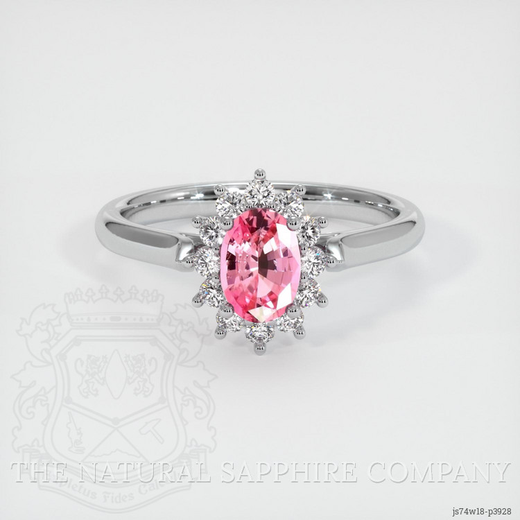 The ring features a beautiful, transparent 0.67 carat oval shape pink sapphire with the dimensions of 6.66 x 4.64 x 2.92 mm and a mixed brilliant cut. It has a clarity grade of very slightly included (evaluated at eye level), medium color saturation, and an excellent polish. The origin of this sapphire is Ceylon(Sri Lanka).