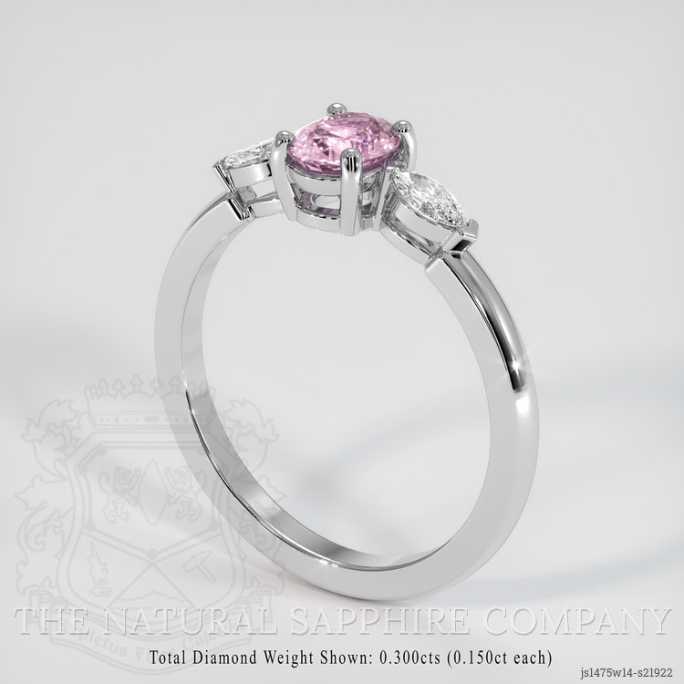 The design around the centre sapphire tells a complementary story. Flanking the pink oval are natural white diamonds in a marquise shape, with a total weight of approximately 0.30 carats. These diamonds carry clarity grades of Very Slightly Included, VS1 and VS2, and a colour grade of I, which together deliver bright scintillation and elegant contrast without overwhelming the centre stone. The marquise form stretches light along the band, cradling the pink sapphire and creating a classic three stone silhouette that speaks of both tradition and contemporary taste. The entire ensemble is set in 14K white gold, chosen for its cool tone that highlights the pink without diminishing warmth. The setting is carefully engineered to lift the sapphire so that light travels beneath the stone, accentuating its mixed brilliant facets and the excellent polish, while secure prongs keep the gem safe for everyday wear.