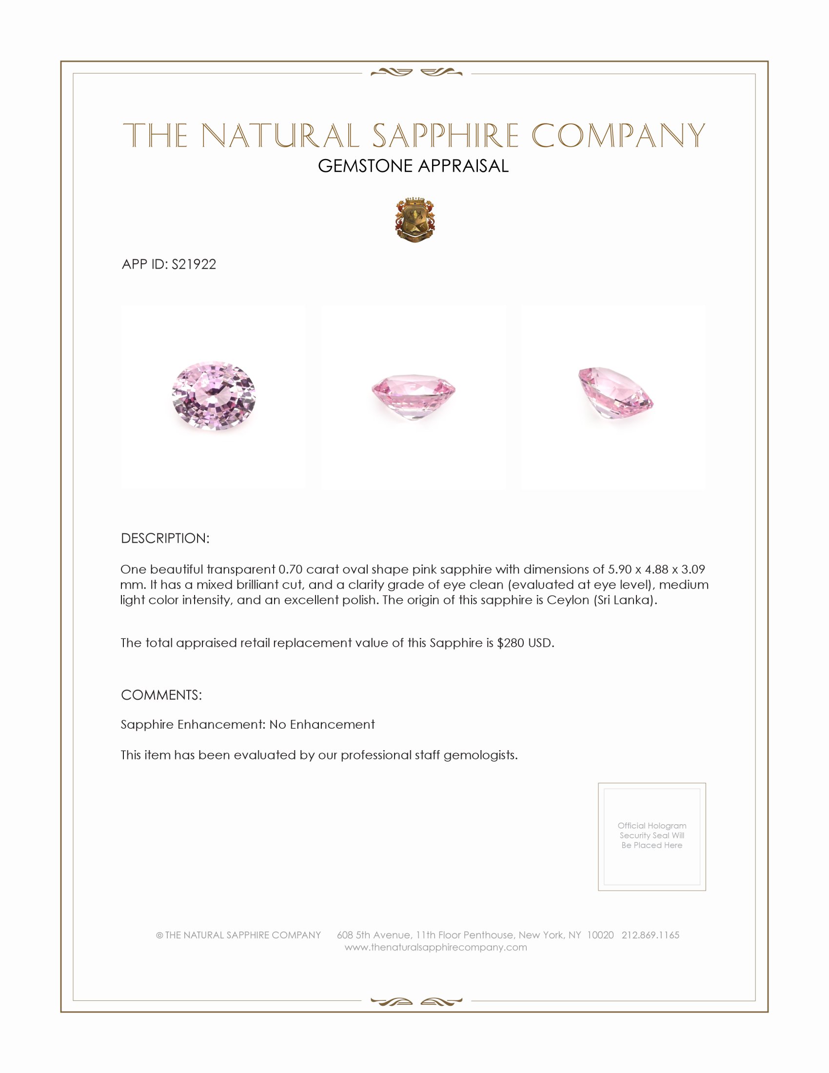 Every gemstone has a story that begins long before it reaches the jeweller’s bench, and this ring carries with it the warm, sunlit history of Ceylon, Sri Lanka. The centrepiece is a transparent 0.70 carat oval pink sapphire, measuring 5.90 by 4.88 by 3.09 millimetres, cut in a mixed brilliant style that balances sparkle and colour. Sourced from the famed alluvial gravels and hillside veins of Sri Lanka, this gem shows the gentle, natural character that makes Ceylon sapphires so beloved. Its medium light colour saturation gives a delicate, romantic pink that shifts subtly as it moves, and its eye clean clarity, evaluated at eye level, means the stone presents a clean, luminous face that invites the eye to explore its depth. The sapphire is untreated, with no enhancement, and enjoys an excellent polish, so what you see is the unaltered beauty of nature brought to a refined finish by master cutters. At The Natural Sapphire Company we celebrate this provenance, because every facet and every hue in this stone is a fingerprint of Earth and place.