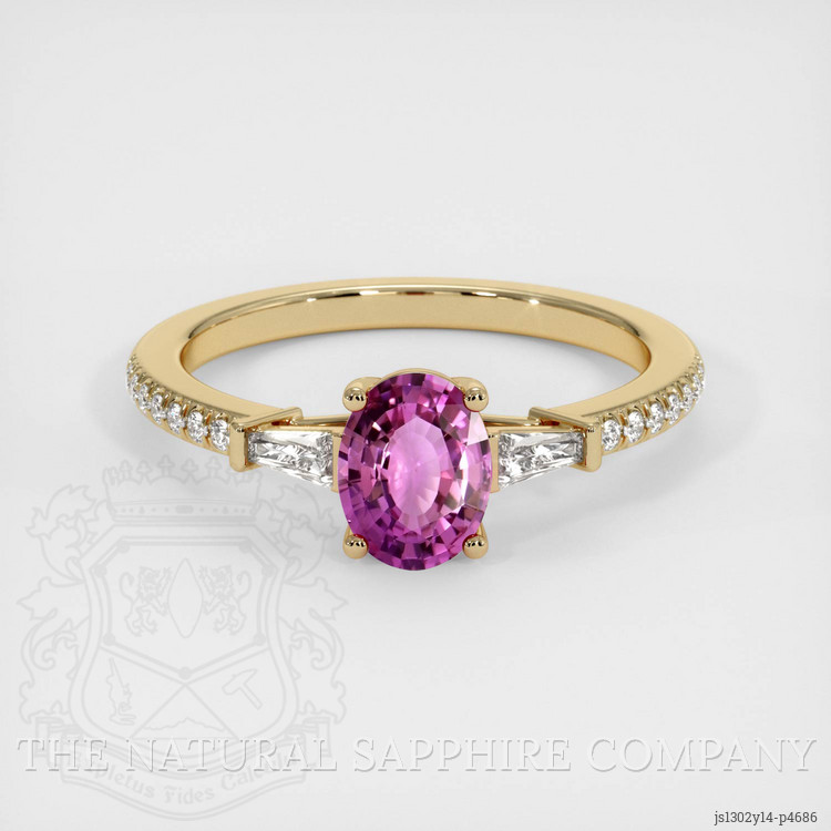 The ring features a beautiful, transparent 0.78 carat oval shape pink sapphire with the dimensions of 6.66 x 5.21 x 2.89 mm and a mixed brilliant cut. It has a clarity grade of eye clean (evaluated at eye level), vivid color saturation, and an excellent polish. The origin of this sapphire is Ceylon (Sri Lanka).