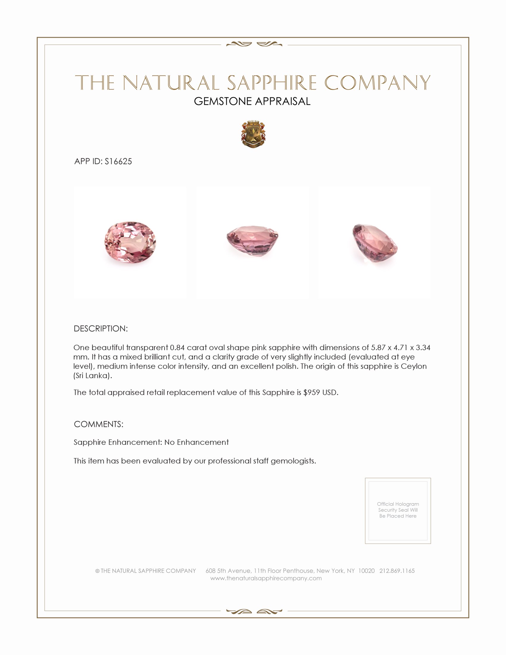 Introducing a ring that captures the essence of timeless elegance and extraordinary rarity. At The Natural Sapphire Company, we are proud to present a masterpiece that fulfills the dreams of those in search of the perfect engagement ring or a unique addition to a gemstone collection. At the heart of this exquisite piece lies a stunning pink sapphire, weighing 0.84 carats and shaped into an alluring oval. With dimensions of 5.87 x 4.71 x 3.34 mm, this sapphire possesses a mixed brilliant cut which enhances its innate sparkle. Its clarity, evaluated as very slightly included at eye level, ensures that each facet reflects light with breathtaking brilliance. The medium intense color saturation deepens the allure of this precious gemstone, accentuated by its excellent polish underscores a quality dedication to beauty and detail that remains unmarred by any enhancement.