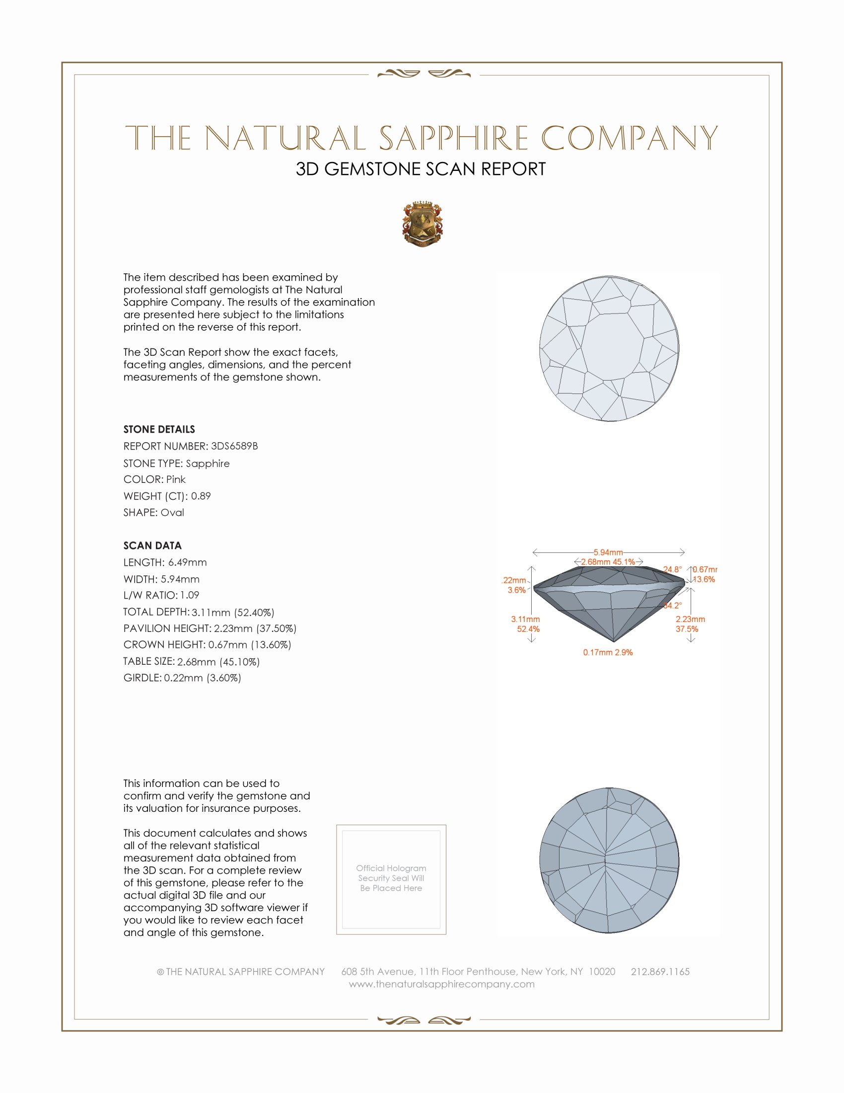 Introducing a masterpiece that transcends the ordinary, a ring of unmatched elegance and beauty exclusively curated by The Natural Sapphire Company. This exquisite piece is a harmonious blend of timeless design and extraordinary craftsmanship, crafted for those who seek the pinnacle of distinction. At the heart of this unique ring lies a breathtaking 0.89 carat pink sapphire from the lush lands of Ceylon, known today as Sri Lanka. This transparent oval-shaped gem, meticulously cut to a mixed brilliant design, invites admiration with its captivating medium intense color saturation and an excellent polish that ensures its brilliance in every light.