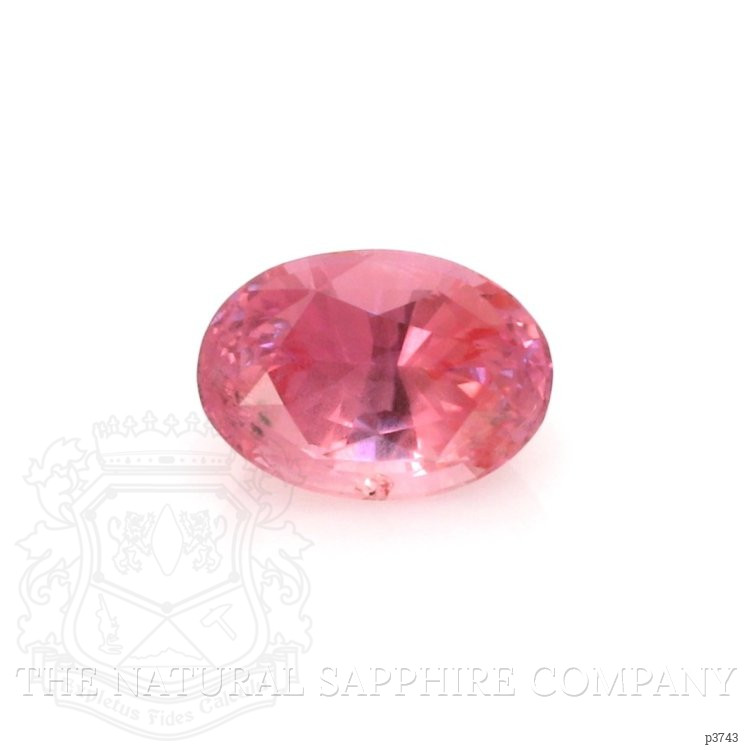 The ring features a beautiful, transparent 0.89 carat oval shape pink sapphire with the dimensions of 6.49 x 4.59 x 3.71 mm and a mixed brilliant cut. It has a clarity grade of very slightly included (evaluated at eye level), medium intense color saturation, and an excellent polish. The origin of this sapphire is Ceylon (Sri Lanka).