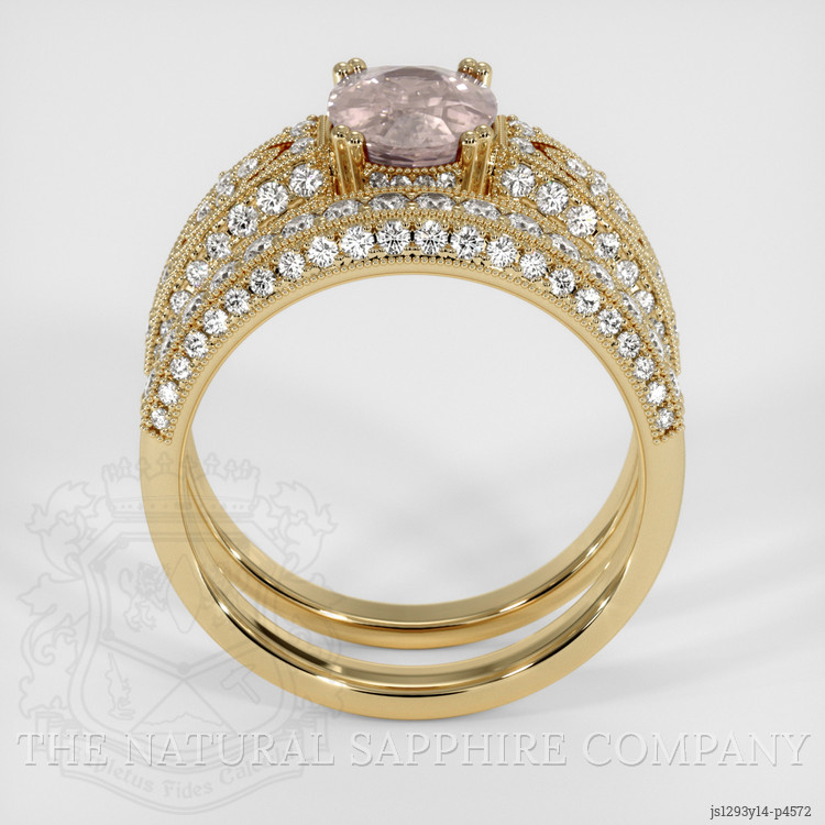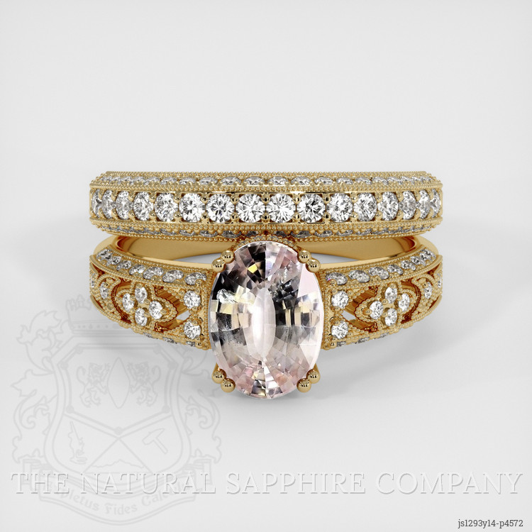 The ring features a beautiful, transparent 1.53 carat oval shape pink sapphire with the dimensions of 8.46 x 6.23 x 3.70 mm and a mixed brilliant cut. It has a clarity grade of very slightly included (evaluated at eye level), light color saturation, and an excellent polish. The origin of this sapphire is Ceylon (Sri Lanka).