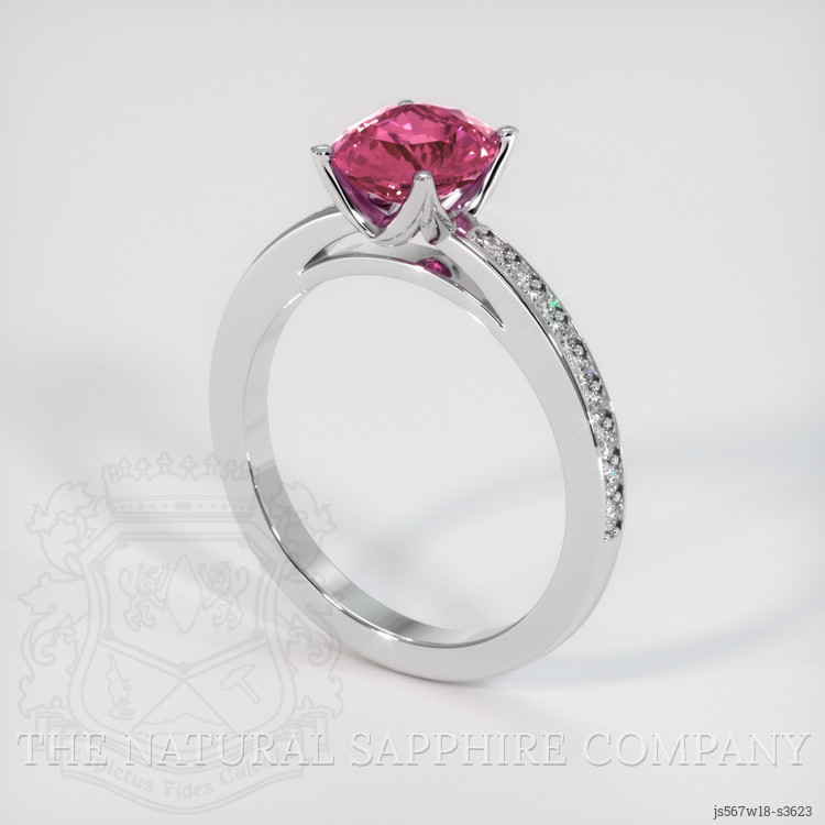 The ring features a beautiful, transparent 2.17 carat oval shape pink sapphire with the dimensions of 8.31 x 7.39 x 4.28 mm and a mixed brilliant cut. It has a clarity grade of very slightly included (evaluated at eye level), intense color saturation, and an excellent polish. The origin of this sapphire is Ceylon (Sri Lanka).