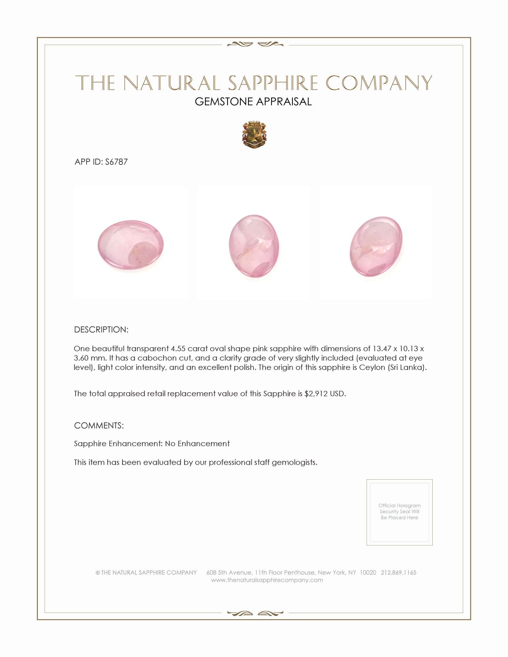 The ring features a beautiful, transparent 4.55 carat oval shape pink sapphire with the dimensions of 13.47 x 10.13 x 3.60 mm and a cabochon cut. It has a clarity grade of very slightly included (evaluated at eye level), light color saturation, and an excellent polish. The origin of this sapphire is Ceylon (Sri Lanka).