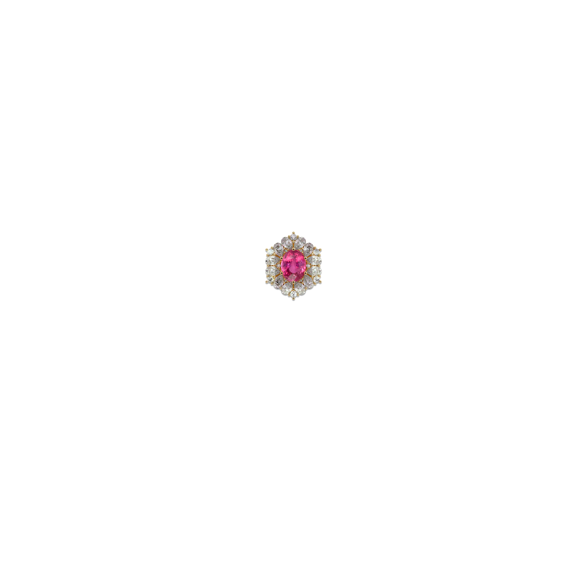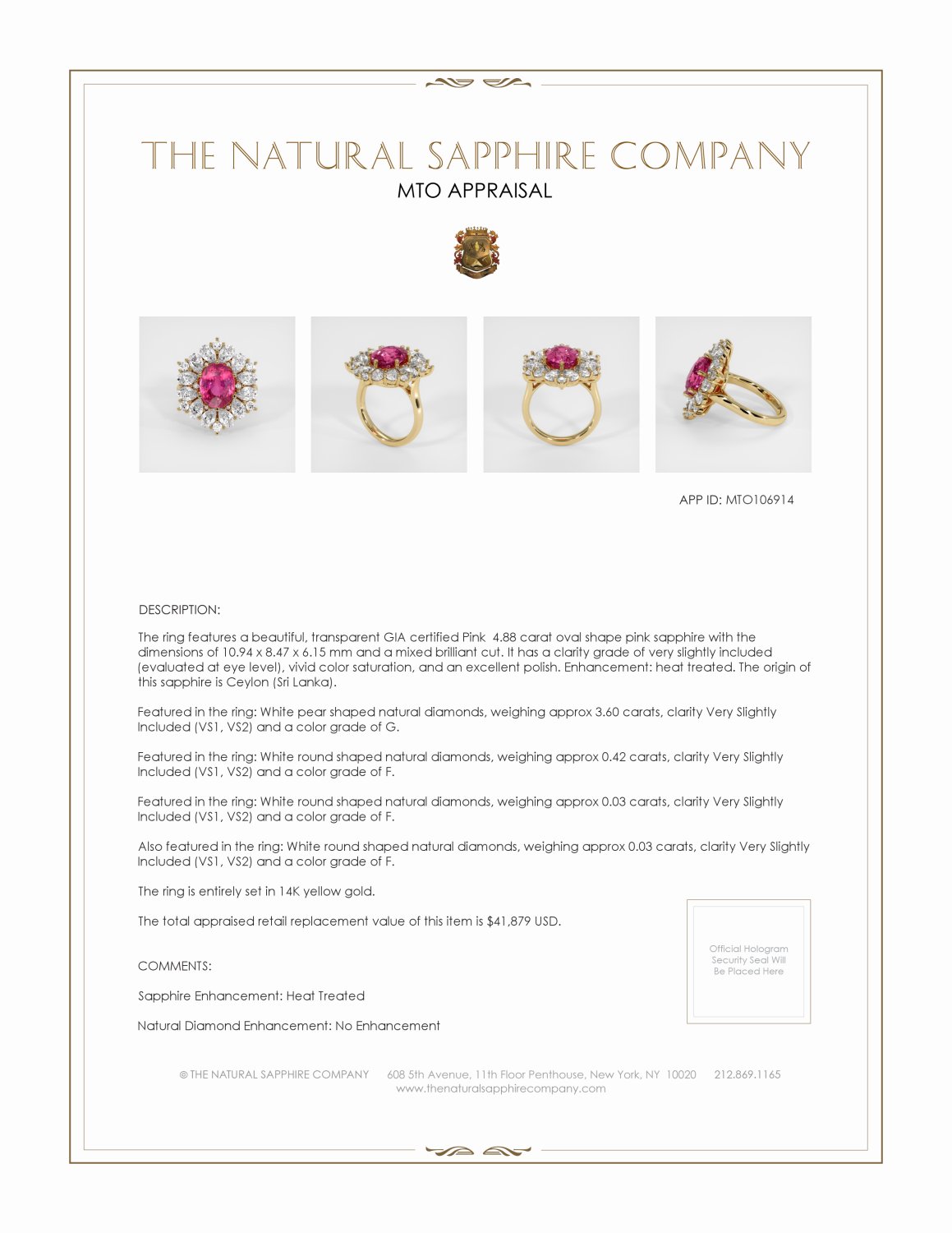 The ring features a beautiful, transparent 4.88 carat oval shape pink sapphire with the dimensions of 10.94 x 8.47 x 6.15 mm and a mixed brilliant cut. It has a clarity grade of very slightly included (evaluated at eye level), vivid color saturation, and an excellent polish. The origin of this sapphire is Ceylon (Sri Lanka).