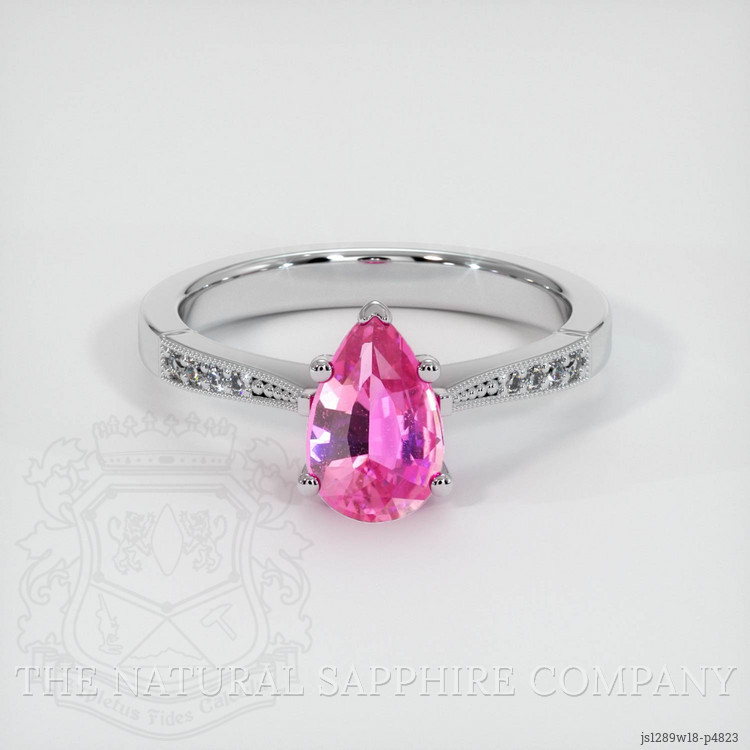 The ring features a beautiful, transparent 1.24 carat pear shape pink sapphire with the dimensions of 8.74 x 5.71 x 3.40 mm and a mixed brilliant cut. It has a clarity grade of very slightly included (evaluated at eye level), intense color saturation, and an excellent polish. The origin of this sapphire is Ceylon (Sri Lanka).