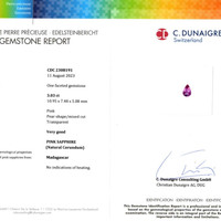 The ring features a beautiful, transparent C.Dunaigre certified Pink 3.03 carat pear shape pink sapphire with the dimensions of 10.95 x 7.45 x 5.09 mm and a mixed brilliant cut. It has a clarity grade of very slightly included (evaluated at eye level), vivid color saturation, and an excellent polish. The origin of this sapphire is Madagascar.