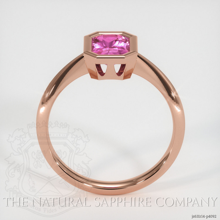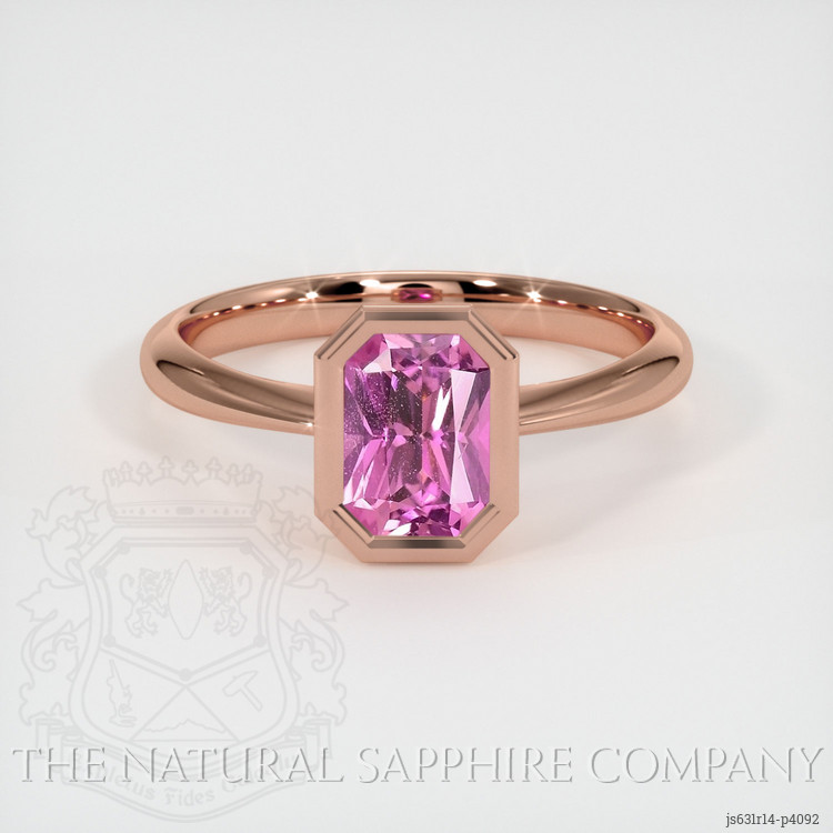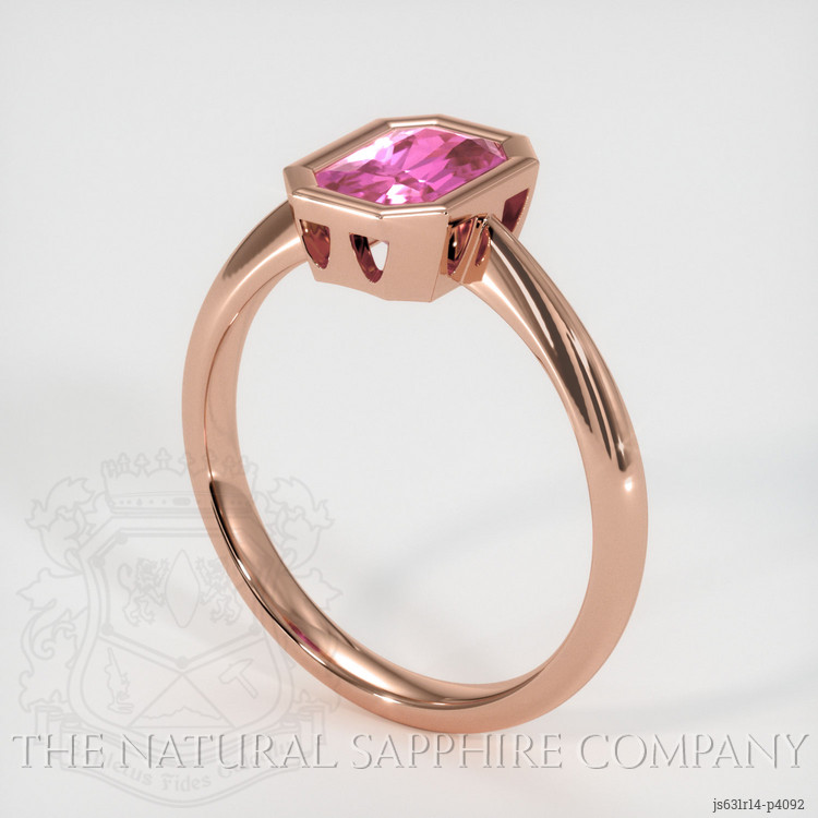 The ring features a beautiful, transparent 0.86 carat radiant shape pink sapphire with the dimensions of 7.01 x 4.89 x 3.15 mm and a radiant cut. It has a clarity grade of very slightly included (evaluated at eye level), medium intense color saturation, and an excellent polish. The origin of this sapphire is Ceylon (Sri Lanka).