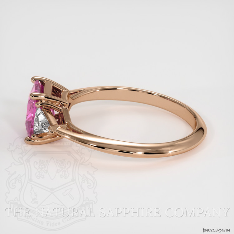 The ring features a beautiful, transparent 1.23 carat radiant shape pink sapphire with the dimensions of 6.49 x 5.64 x 3.47 mm and a radiant cut. It has a clarity grade of very slightly included (evaluated at eye level), intense color saturation, and an excellent polish. The origin of this sapphire is Ceylon (Sri Lanka). The sapphire has been sourced through ethical mining practices ensuring conflict-free sourcing, appealing to socially conscious customers who prioritize responsible consumption. White trillion shaped diamonds are also featured in the ring, weighing approximately 0.30 carats each. With a clarity grading of very slightly included (VS1 and VS2) and a color grade of E, these diamonds provide additional sparkle. The ring is entirely set in 14K rose gold, ensuring the gems are securely set for peace of mind.