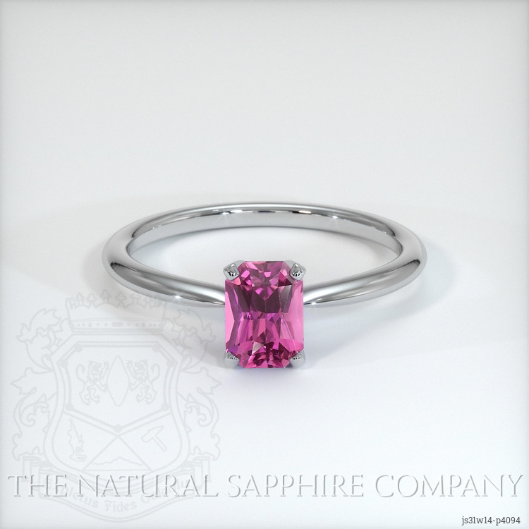 The ring features a beautiful, transparent 1.26 carat radiant shape pink sapphire with the dimensions of 7.22 x 5.25 x 4.06 mm and a radiant cut. It has a clarity grade of very slightly included (evaluated at eye level), intense color saturation, and an excellent polish. The origin of this sapphire is Ceylon (Sri Lanka).
