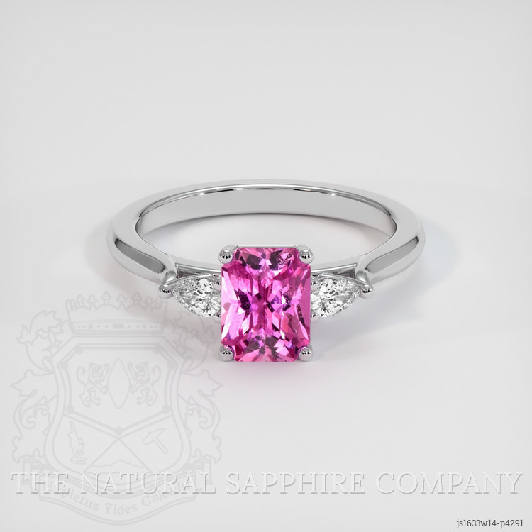 The ring features a beautiful, transparent 1.32 carat radiant shape pink sapphire with the dimensions of 7.19 x 5.57 x 3.79 mm and a radiant cut. It has a clarity grade of very slightly included (evaluated at eye level), intense color saturation, and an excellent polish. The origin of this sapphire is Ceylon (Sri Lanka).