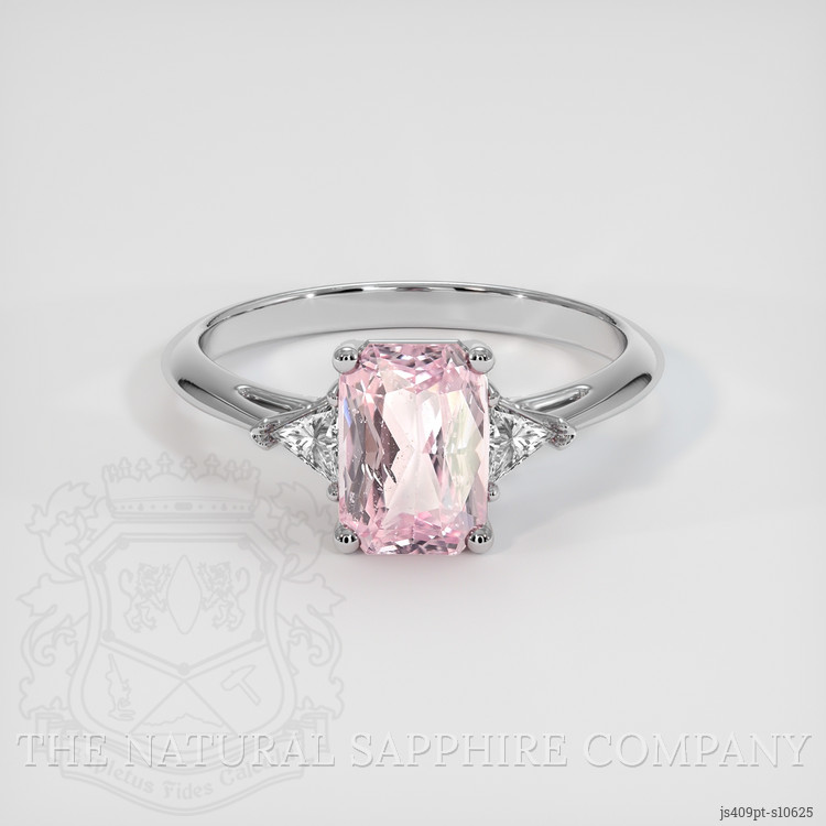 A rare example of refined femininity and considered design, this ring features a transparent 2.15 carat radiant shape pink sapphire sourced from Ceylon, Sri Lanka, each facet a testament to nature and masterful cutting. The sapphire measures 8.01 by 5.64 by 4.40 mm, with a radiant cut that maximizes brilliance and a light color saturation that reads as a delicate, truly natural pink. Graded as Very Slightly Included at eye level, with an excellent polish, this stone is untreated and free from enhancement, a purity that is increasingly scarce in today, an authenticity that only a few connoisseurs will experience. Flanking the center stone are white trillion shaped natural diamonds, weighing approximately 0.24 carats in total, with clarity grades of Very Slightly Included VS1 and VS2, and a color grade of E, chosen to elevate the pink sapphire without overpowering it. The entire composition is set in 14K white gold, a subtle and enduring stage that lets the pink sapphire remain the undisputed focal point. At The Natural Sapphire Company we select and craft each piece with an eye for rarity, ensuring that this ring is not only jewelry, but a singular expression of provenance and precision.