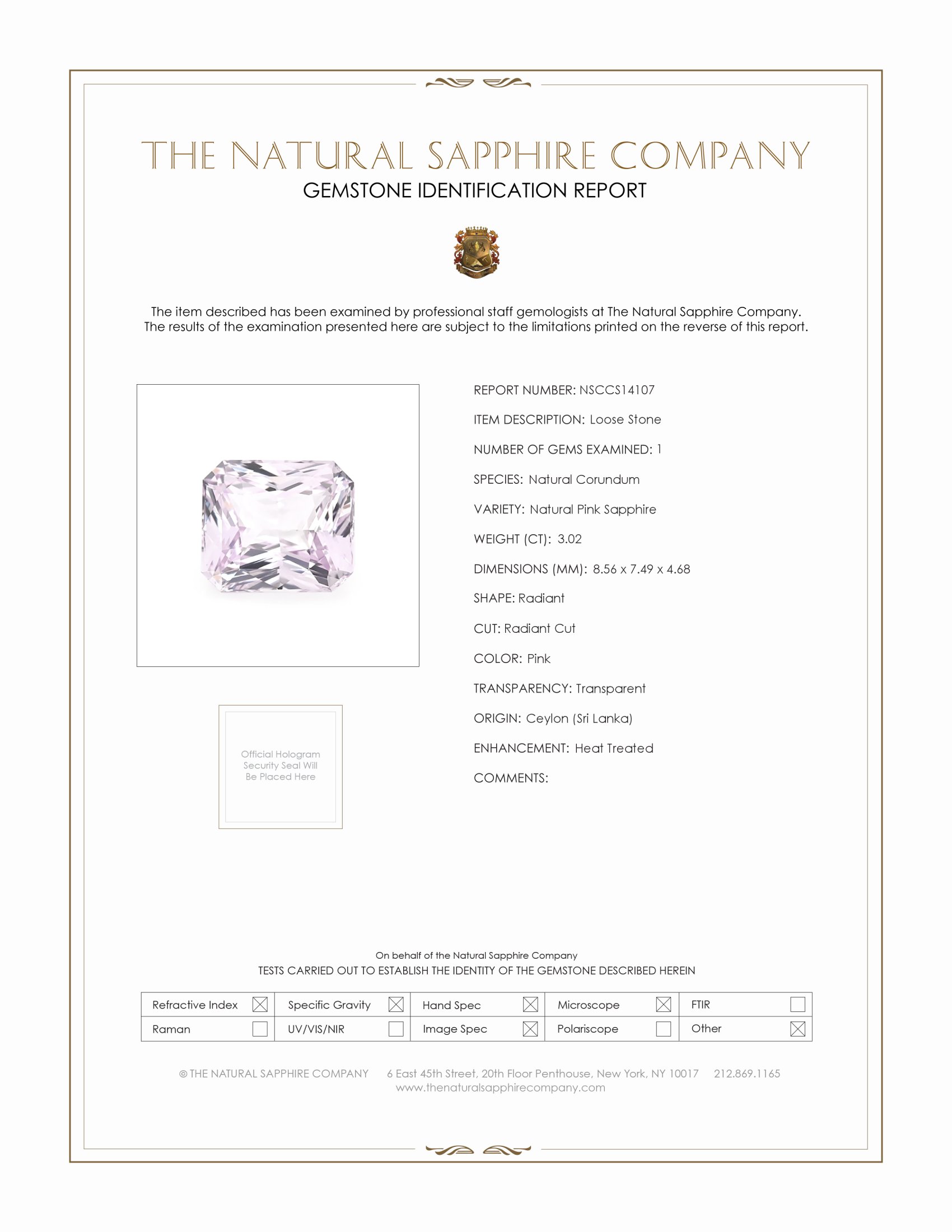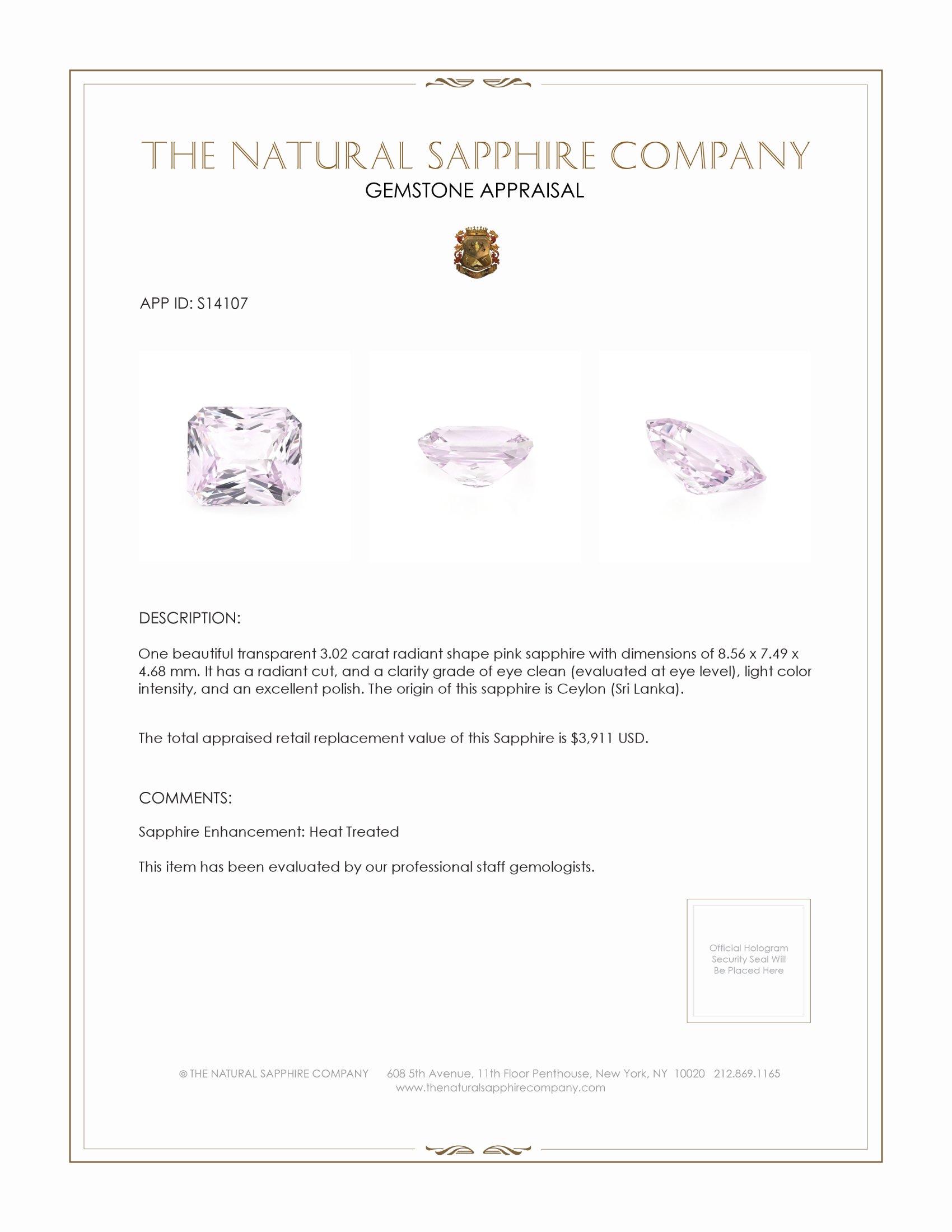 The ring features a beautiful, transparent 3.02 carat radiant shape pink sapphire with the dimensions of 8.56 x 7.49 x 4.68 mm and a radiant cut. It has a clarity grade of eye clean (evaluated at eye level), light color saturation, and an excellent polish. The origin of this sapphire is Ceylon (Sri Lanka).