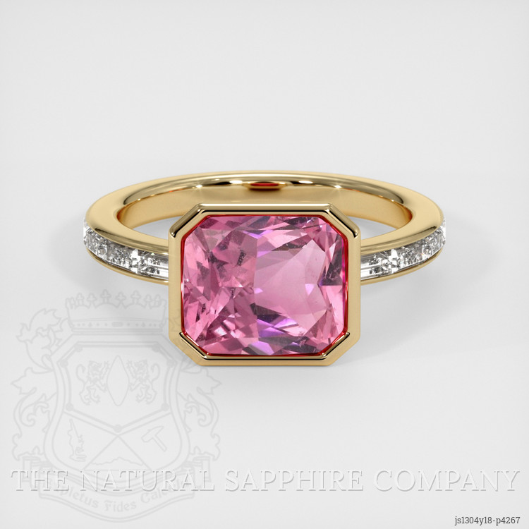 The ring features a beautiful, transparent 3.37 carat radiant shape pink sapphire with the dimensions of 9.09 x 8.09 x 4.79 mm and a radiant cut. It has a clarity grade of very slightly included (evaluated at eye level), intense color saturation, and an excellent polish. The origin of this sapphire is Ceylon (Sri Lanka).