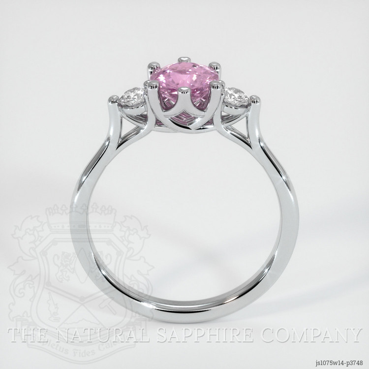 The ring features a beautiful, transparent 0.86 carat round shape pink sapphire with the dimensions of 5.78 x 5.71 x 3.57 mm and a mixed brilliant cut. It has a clarity grade of very slightly included (evaluated at eye level), medium light color saturation, and an excellent polish. The origin of this sapphire is Ceylon (Sri Lanka).