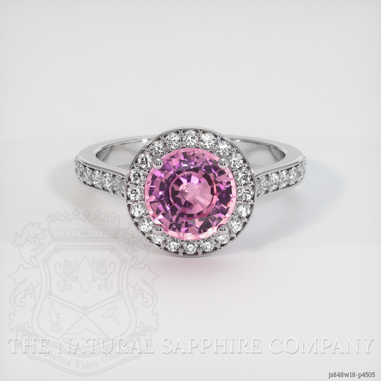 The ring features a beautiful, transparent 2.15 carat round shape pink sapphire with the dimensions of 7.63 x 7.60 x 4.65 mm and a mixed brilliant cut. It has a clarity grade of very slightly included (evaluated at eye level), medium intense color saturation, and an excellent polish. The origin of this sapphire is Ceylon (Sri Lanka).