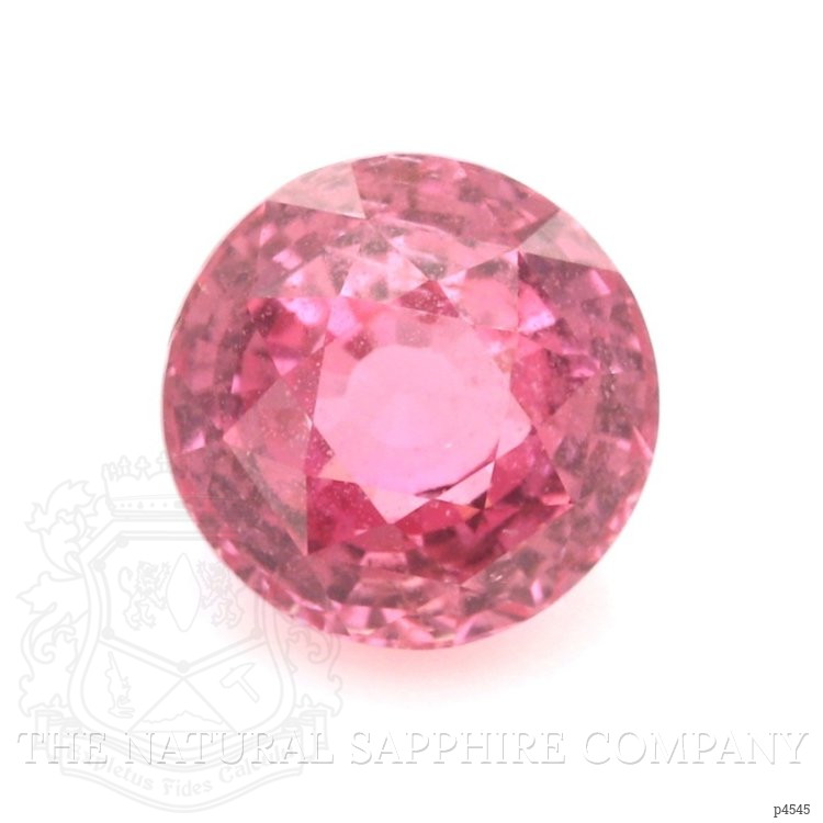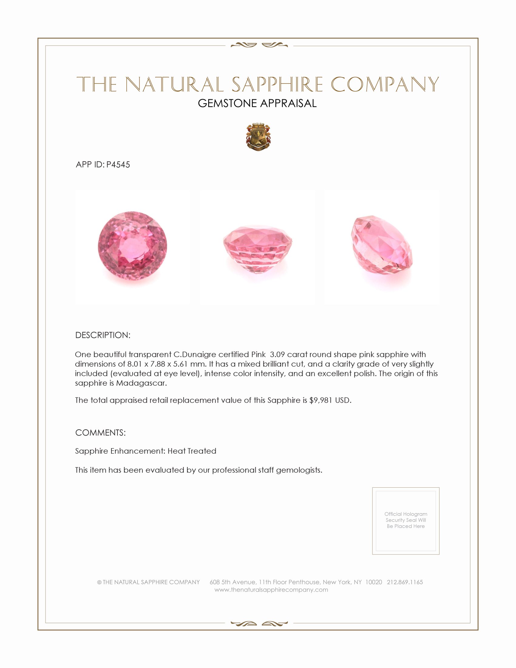 The ring features a beautiful, transparent C.Dunaigre certified Pink 3.09 carat round shape pink sapphire with the dimensions of 8.01 x 7.88 x 5.61 mm and a mixed brilliant cut. It has a clarity grade of very slightly included (evaluated at eye level), intense color saturation, and an excellent polish. The origin of this sapphire is Madagascar.