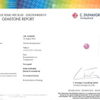The ring features a beautiful, transparent C.Dunaigre certified Pink 7.81 carat round shape pink sapphire with the dimensions of 11.32 x 11.18 x 7.63 mm and a mixed brilliant cut. It has a clarity grade of very slightly included (evaluated at eye level), medium intense color saturation, and an excellent polish. The origin of this sapphire is Ceylon (Sri Lanka).