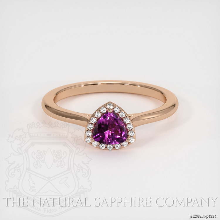 The ring features a beautiful, transparent 0.73 carat trillion shape pink sapphire with the dimensions of 6.02 x 5.99 x 3.11 mm and a trillion cut. It has a clarity grade of very slightly included (evaluated at eye level), vivid color saturation, and an excellent polish. The origin of this sapphire is Ceylon (Sri Lanka).