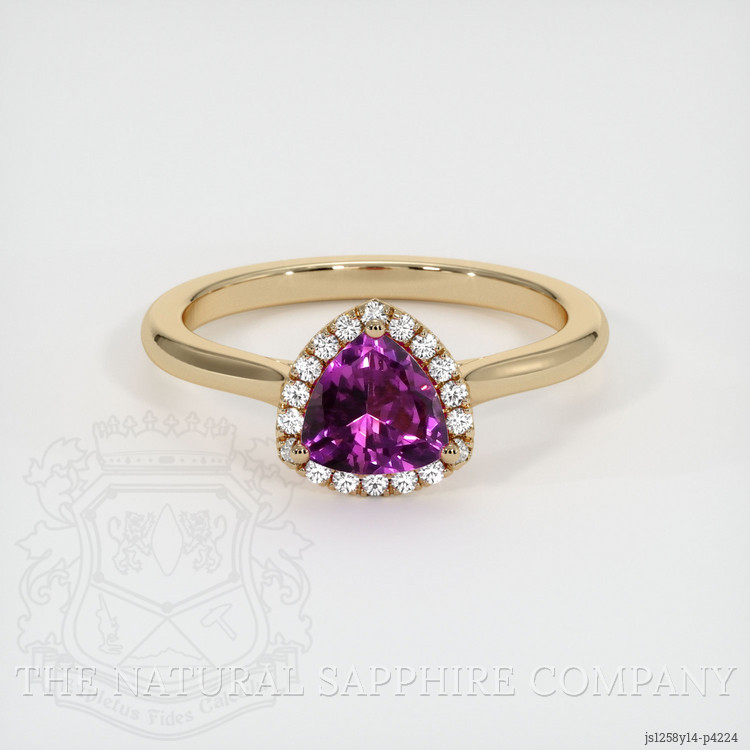 The ring features a beautiful, transparent 0.73 carat trillion shape pink sapphire with the dimensions of 6.02 x 5.99 x 3.11 mm and a trillion cut. It has a clarity grade of very slightly included (evaluated at eye level), vivid color saturation, and an excellent polish. The origin of this sapphire is Ceylon (Sri Lanka).