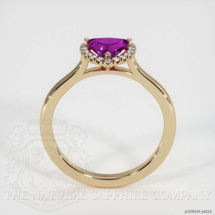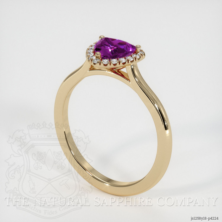 The ring features a beautiful, transparent 0.73 carat trillion shape pink sapphire with the dimensions of 6.02 x 5.99 x 3.11 mm and a trillion cut. It has a clarity grade of very slightly included (evaluated at eye level), vivid color saturation, and an excellent polish. The origin of this sapphire is Ceylon (Sri Lanka).