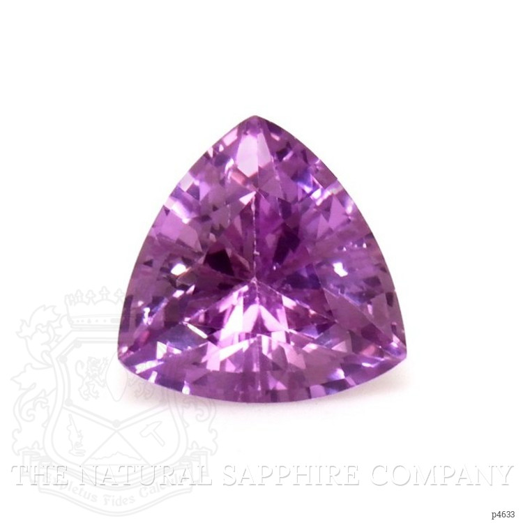 The ring features a beautiful, transparent 0.88 carat trillion shape pink sapphire with the dimensions of 5.94 x 6.06 x 3.63 mm and a trillion cut. It has a clarity grade of eye clean (evaluated at eye level), medium intense color saturation, and an excellent polish. The origin of this sapphire is Ceylon (Sri Lanka).