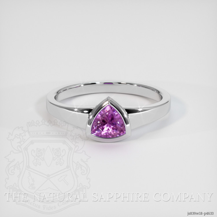 The ring features a beautiful, transparent 0.88 carat trillion shape pink sapphire with the dimensions of 5.94 x 6.06 x 3.63 mm and a trillion cut. It has a clarity grade of eye clean (evaluated at eye level), medium intense color saturation, and an excellent polish. The origin of this sapphire is Ceylon (Sri Lanka).