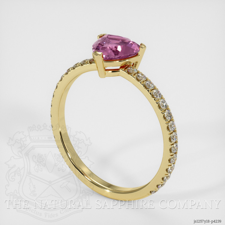 The ring features a beautiful, transparent 1.09 carat trillion shape pink sapphire with the dimensions of 6.42 x 6.49 x 3.69 mm and a trillion cut. It has a clarity grade of very slightly included (evaluated at eye level), intense color saturation, and an excellent polish. The origin of this sapphire is Ceylon (Sri Lanka).