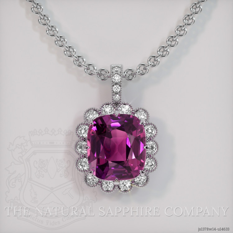 The pendant features a beautiful, transparent GIA certified 27.41 carat cushion shape pinkish purple sapphire with the dimensions of 17.72 x 15.69 x 10.54 mm and a mixed brilliant cut. It has a clarity grade of eye clean (evaluated at eye level), intense color saturation, and an excellent polish. The origin of this sapphire is Madagascar.