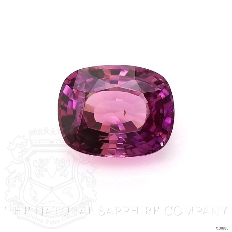 The ring features a beautiful, transparent 1.16 carat cushion shape pinkish purple sapphire with the dimensions of 6.80 x 5.43 x 3.38 mm and a mixed brilliant cut. It has a clarity grade of very slightly included (evaluated at eye level), intense color saturation, and an excellent polish. The origin of this sapphire is Ceylon (Sri Lanka).
