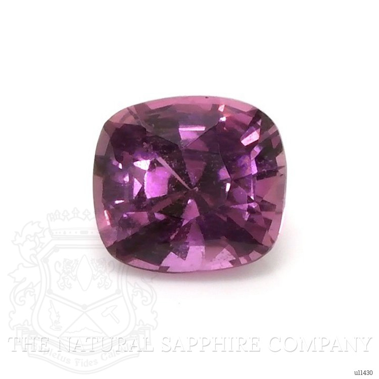 The ring features a beautiful, transparent 1.37 carat cushion shape pinkish purple sapphire with the dimensions of 6.64 x 6.07 x 4.39 mm and a mixed brilliant cut. It has a clarity grade of very slightly included (evaluated at eye level), intense color saturation, and an excellent polish. The origin of this sapphire is Ceylon (Sri Lanka).