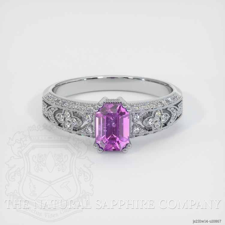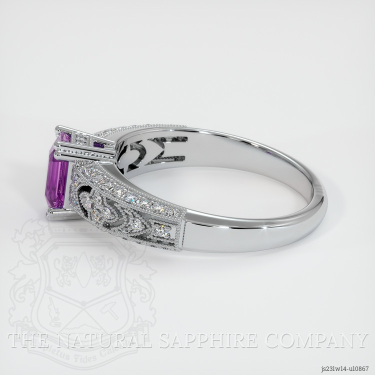 The ring features a beautiful, transparent 1.03 carat emerald cut shape pinkish purple sapphire with the dimensions of 6.70 x 4.71 x 3.69 mm and a emerald cut. It has a clarity grade of very slightly included (evaluated at eye level), medium intense color saturation, and an excellent polish. The origin of this sapphire is Ceylon (Sri Lanka).