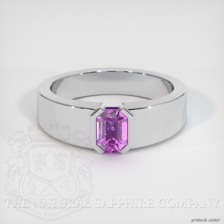 The men's ring features a beautiful, transparent 1.03 carat emerald shape pinkish purple sapphire with the dimensions of 6.70 x 4.71 x 3.69 mm and a emerald cut. It has a clarity grade of very slightly included (evaluated at eye level), medium intense color saturation, and an excellent polish. The origin of this sapphire is Ceylon (Sri Lanka).