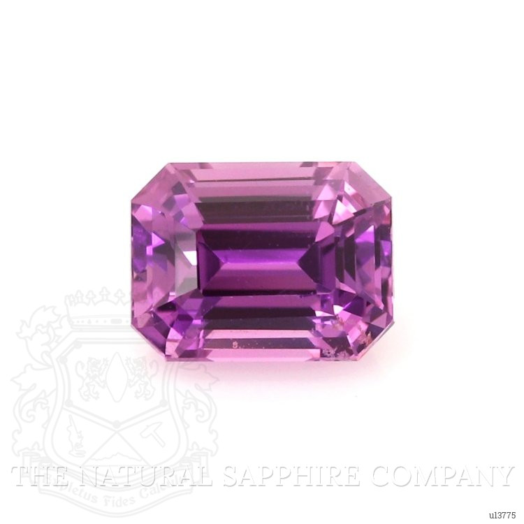 The ring features a beautiful, transparent 1.30 carat emerald cut shape pinkish purple sapphire with the dimensions of 6.56 x 4.99 x 3.99 mm and a step cut. It has a clarity grade of very slightly included (evaluated at eye level), vivid color saturation, and an excellent polish. The origin of this sapphire is Ceylon (Sri Lanka).