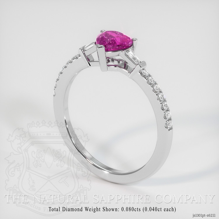 The ring features a beautiful, transparent 0.83 carat heart shape pink sapphire with the dimensions of 5.76 x 5.66 x 3.32 mm and a mixed brilliant cut. It has a clarity grade of very slightly included (evaluated at eye level), vivid color saturation, and an excellent polish. The origin of this sapphire is Madagascar.