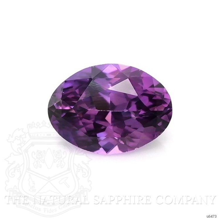 The ring features a beautiful, transparent 0.78 carat oval shape pinkish purple sapphire with the dimensions of 6.95 x 5.06 x 3.11 mm and a mixed brilliant cut. It has a clarity grade of very slightly included (evaluated at eye level), intense color saturation, and an excellent polish. The origin of this sapphire is Ceylon (Sri Lanka).