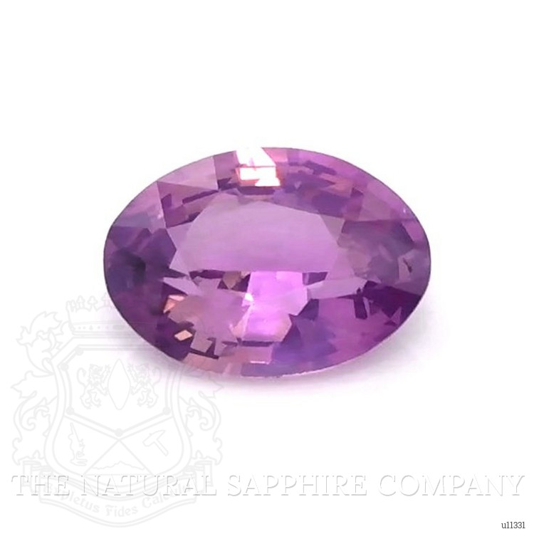 The ring features a beautiful, transparent 0.80 carat oval shape pinkish purple sapphire with the dimensions of 7.03 x 5.06 x 2.99 mm and a mixed brilliant cut. It has a clarity grade of very slightly included (evaluated at eye level), medium intense color saturation, and an excellent polish. The origin of this sapphire is Ceylon (Sri Lanka).