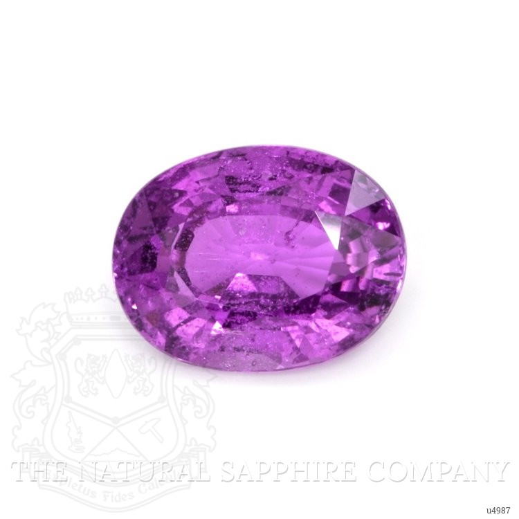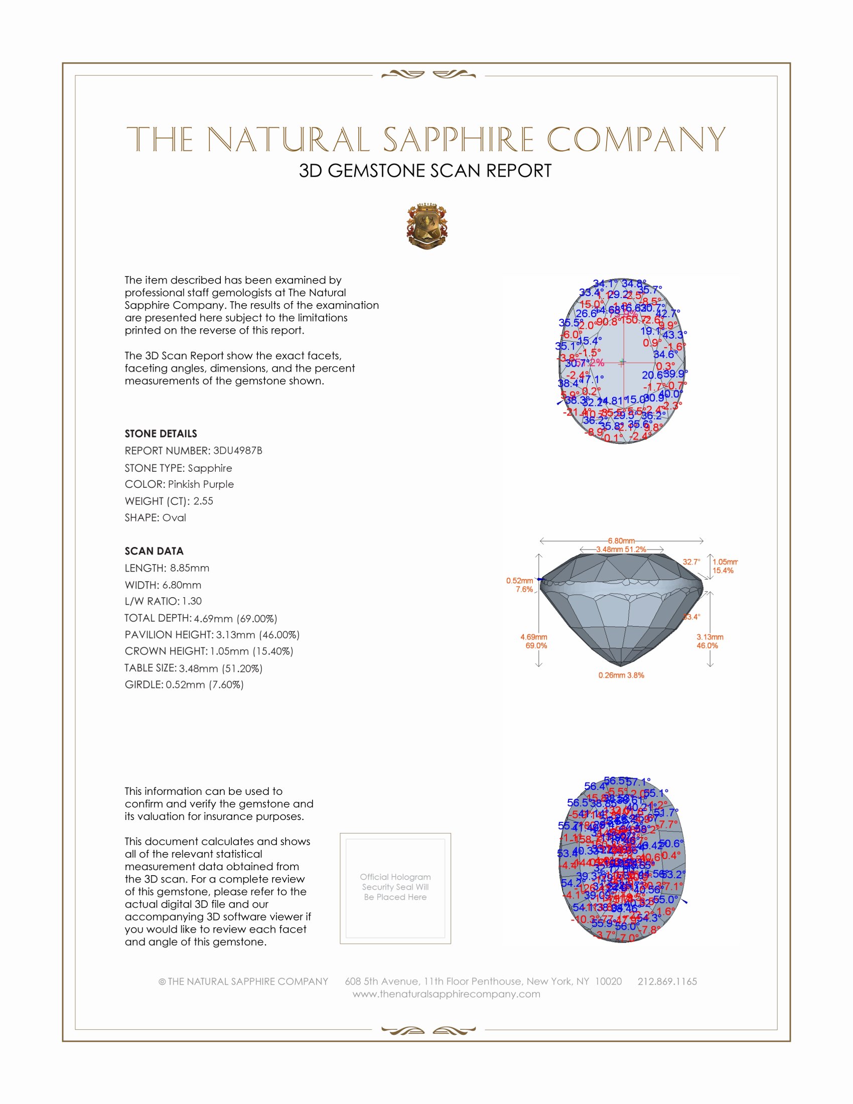 The ring features a beautiful, transparent Other certified Pinkish Purple 2.55 carat oval shape pinkish purple sapphire with the dimensions of 8.85 x 6.80 x 4.69 mm and a mixed brilliant cut. It has a clarity grade of slightly included (evaluated at eye level), intense color saturation, and an excellent polish. The origin of this sapphire is Madagascar.