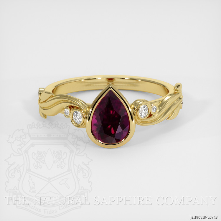 The ring features a beautiful, transparent 1.31 carat pear shape pinkish purple sapphire with the dimensions of 8.25 x 5.70 x 4.35 mm and a mixed brilliant cut. It has a clarity grade of very slightly included (evaluated at eye level), dark color saturation, and an excellent polish. The origin of this sapphire is Ceylon (Sri Lanka).