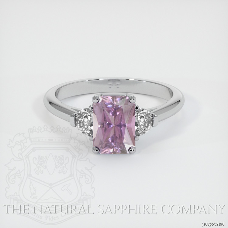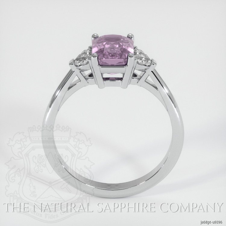 The ring features a beautiful, transparent 2.28 carat radiant shape pinkish purple sapphire with the dimensions of 8.16 x 6.03 x 4.86 mm and a radiant cut. It has a clarity grade of very slightly included (evaluated at eye level), medium intense color saturation, and an excellent polish. The origin of this sapphire is Ceylon (Sri Lanka).