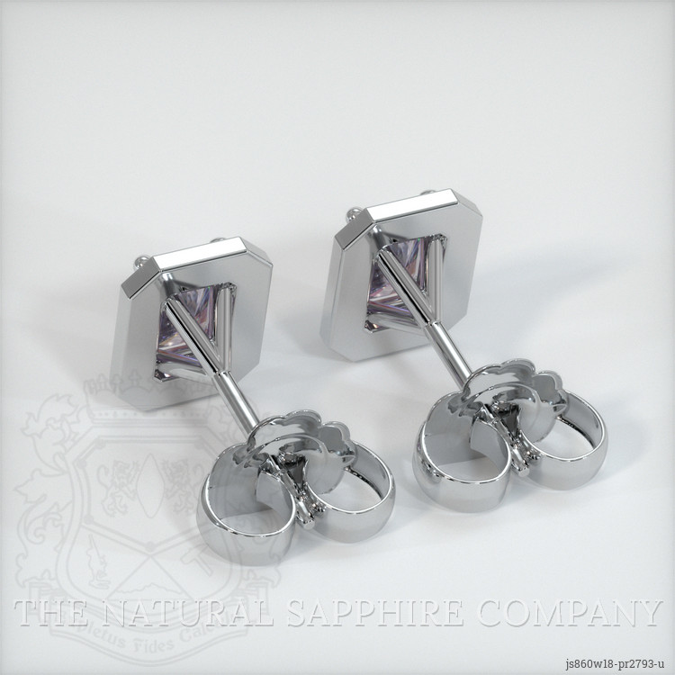 The earrings feature a beautiful, transparent pair of sapphires that are 1.35 total carat weight. They are radiant shape purple sapphires, with the dimensions of 5.98 x 4.03 x 2.79 mm and are radiant cut, have a clarity grade of very slightly included (evaluated at eye level), medium light color saturation, and an excellent polish. The origin of this pair of sapphires is Ceylon (Sri Lanka).