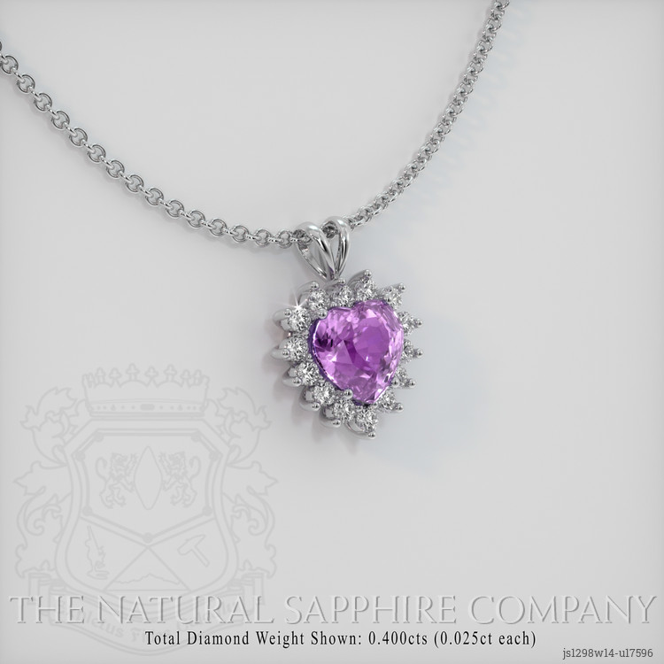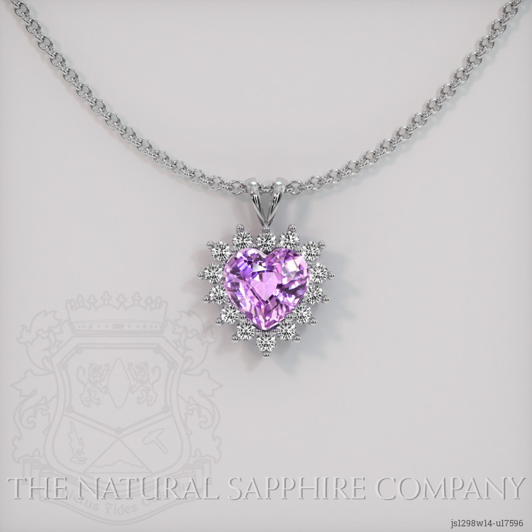 The pendant features a beautiful, transparent 2.00 carat heart shape purple sapphire with the dimensions of 7.18 x 7.60 x 4.72 mm and a mixed brilliant cut. It has a clarity grade of eye clean (evaluated at eye level), medium light color saturation, and an excellent polish. The origin of this sapphire is Ceylon (Sri Lanka).