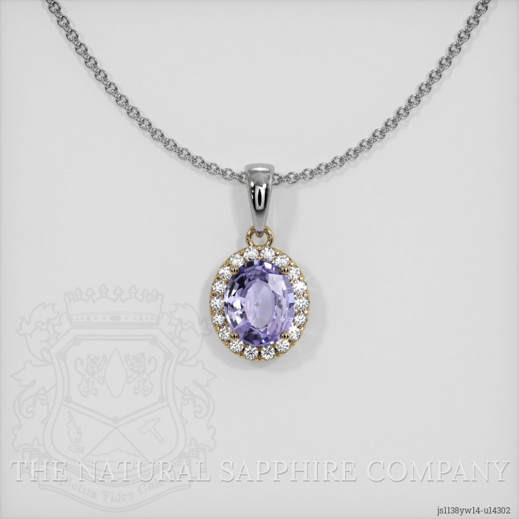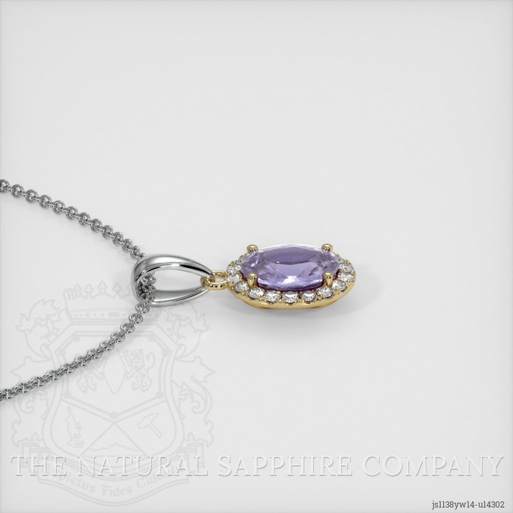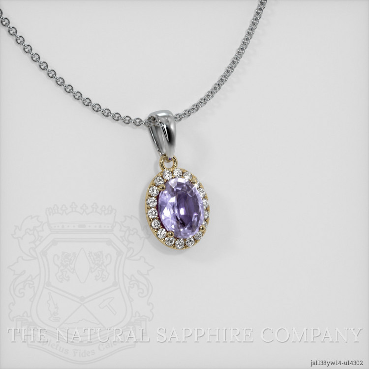 The pendant features a beautiful, transparent 0.57 carat oval shape purple sapphire with the dimensions of 5.86 x 4.82 x 2.44 mm and a mixed brilliant cut. It has a clarity grade of very slightly included (evaluated at eye level), intense color saturation, and an excellent polish. The origin of this sapphire is Ceylon (Sri Lanka).