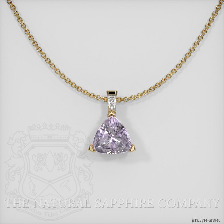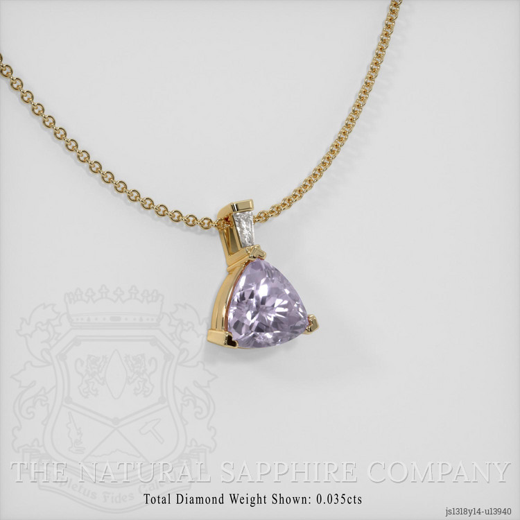 The pendant features a beautiful, transparent 0.98 carat trillion shape purple sapphire with the dimensions of 6.07 x 6.11 x 4.03 mm and a trillion cut. It has a clarity grade of very slightly included (evaluated at eye level), medium intense color saturation, and an excellent polish. The origin of this sapphire is Montana.