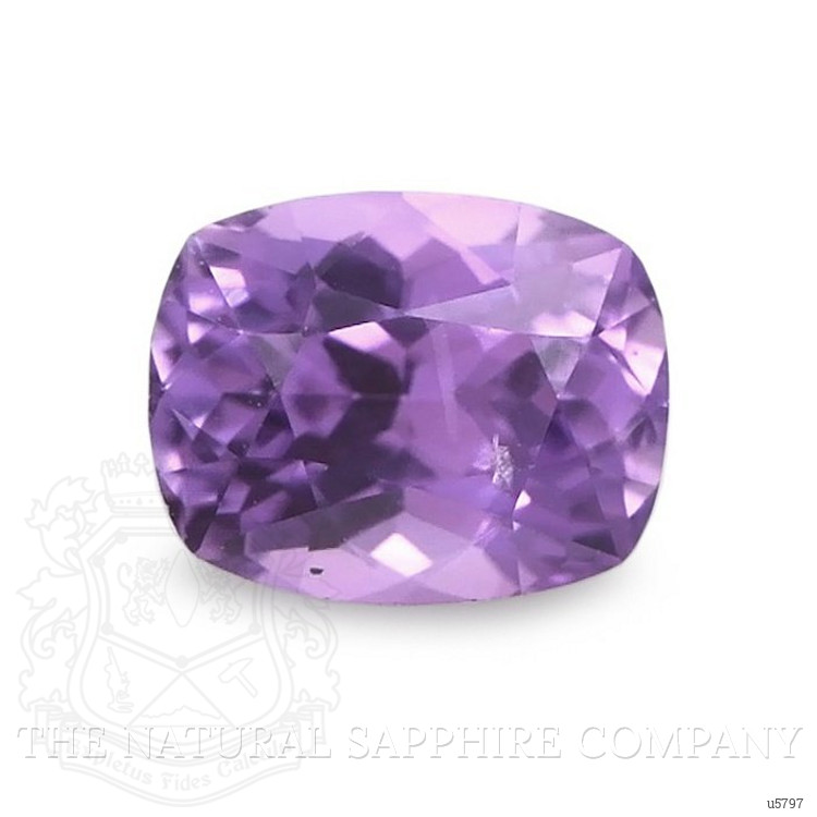 The ring features a beautiful, transparent 0.87 carat cushion shape purple sapphire with the dimensions of 5.87 x 4.66 x 3.63 mm and a mixed brilliant cut. It has a clarity grade of very slightly included (evaluated at eye level), intense color saturation, and an excellent polish. The origin of this sapphire is Ceylon (Sri Lanka).